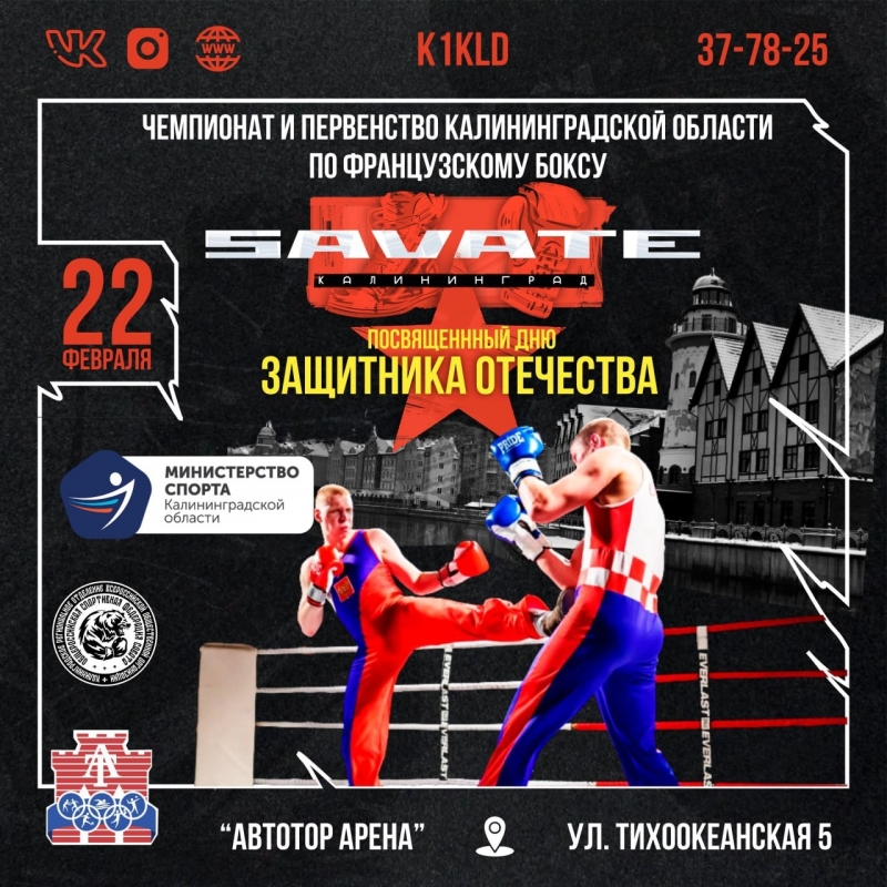 22 февраля в спортивном комплексе "Автотор-Арена" по адресу -Калининград ,улица Тихоокеанская 5 состоится Чемпионат и первенство по французскому боксу сават !