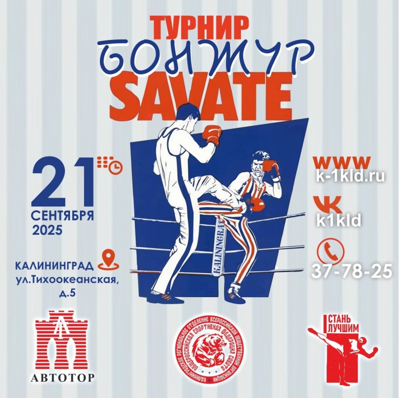 21 сентября,в спортивном комплексе "Автотор Арена" по адресу-город Калининград,улица Тихоакеанская 5,состоится турнир по французскому боксу сават "